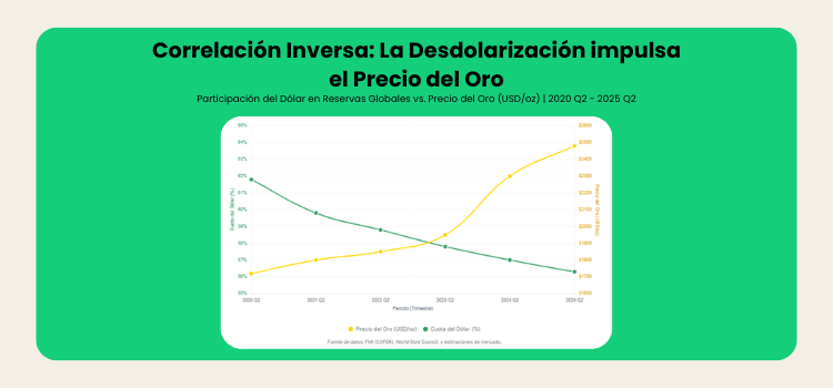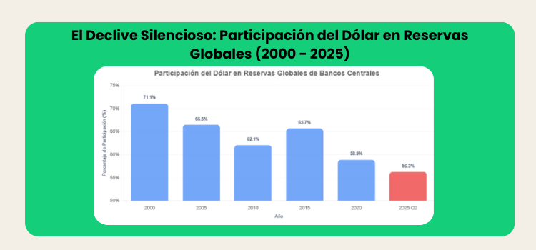 El debilitamiento del dólar no es un evento aislado, sino el resultado de una profunda desconfianza en la economía de Estados Unidos y su manejo de la deuda. La participación del dólar estadounidense en las reservas globales de los bancos centrales ha caído a un 56,3% en el segundo trimestre de 2025, el nivel más bajo desde 1994. El principal motor de esta huida es el creciente riesgo de la deuda estadounidense. Solo en los últimos 12 meses, el gobierno federal ha pagado una cifra récord de 1,2 billones de dólares en intereses sobre su deuda pública. Esta situación, junto con la masiva impresión de dinero para cubrir déficits, ha hecho que los bancos centrales, en un movimiento que no se veía en casi 30 años, ahora posean más oro que bonos del Tesoro estadounidense.