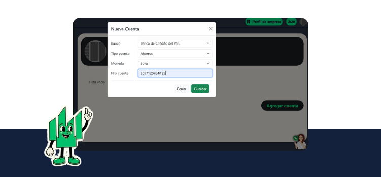 - Banco.- Tipo de cuenta (ahorro o corriente).- Número de cuenta.- Moneda (soles o dólares)